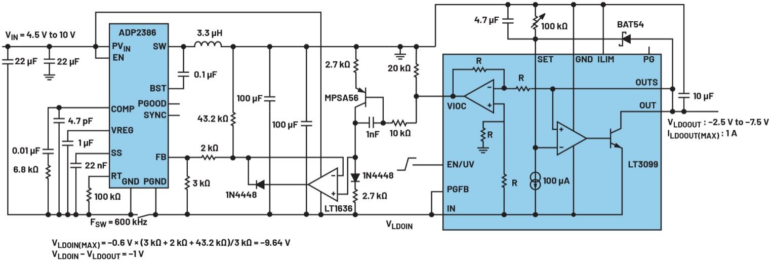 圖5.如果開關(guān)穩(wěn)壓器采用的是反相降壓-升壓配置(使用ADP2386),則負LDO的VIOC電路需要電平轉(zhuǎn)換器