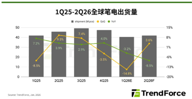 ?預(yù)估1Q26全球筆電出貨季減14.8%,2Q26有望溫和季增