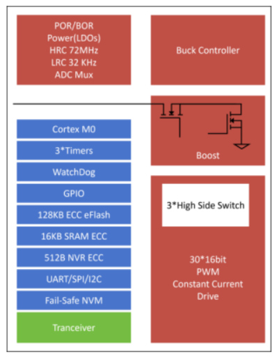 TClux系列創(chuàng)新性地將MCU內(nèi)核、Flash存儲器、LIN/CAN收發(fā)器、同步整流Buck控制器、多通道恒流驅(qū)動模塊 等關(guān)鍵功能集成于單顆芯片中,形成真正意義上的“主控+驅(qū)動+通信”一體化解決方案。一顆芯片即可驅(qū)動多達(dá)48路RGB LED,極大簡化了外圍電路設(shè)計,降低BOM成本與PCB布局難度。