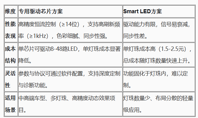 與集成化的Smart LED方案相比,“專用驅(qū)動芯片+普通LED燈珠”架構(gòu)在多個維度展現(xiàn)出明顯優(yōu)勢: