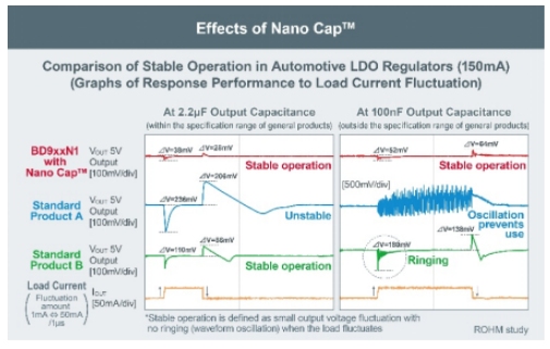 Nano Cap?是指利用ROHM的垂直統(tǒng)合型生產(chǎn)體系,通過融合“電路設(shè)計”、“布局”和“工藝”三大模擬技術(shù)優(yōu)勢而實現(xiàn)的超穩(wěn)定控制技術(shù)。利用這種穩(wěn)定控制技術(shù),可消除模擬電路中電容器相關(guān)的穩(wěn)定運行問題,有助于縮短汽車、工業(yè)設(shè)備、消費電子等各種領(lǐng)域應(yīng)用產(chǎn)品的設(shè)計周期。