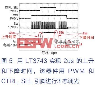 為了保持最準(zhǔn)確的顏色混合能力,LED 驅(qū)動器不僅必須在 3 種不同的電流值上提供三態(tài)電流控制和準(zhǔn)確的 PWM 調(diào)光,而且還必須從相對低電流的穩(wěn)定狀態(tài) (約為 2A) 轉(zhuǎn)換到高得多的穩(wěn)定電流值 (約為 20A),以維持 PWM 調(diào)光邊緣的原狀。LT3743 的獨特設(shè)計使該器件能夠非?斓剡M(jìn)行這類轉(zhuǎn)換。即正如在圖 5 中可以看到的那樣,LT3743 可以在不到 2ms 的時間內(nèi)從 2A 恒定電流狀態(tài)轉(zhuǎn)換到 20A 狀態(tài),從而使該器件非常適用于顏色混合 RGB 應(yīng)用。