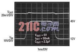 圖3  LT3050 針對負載突降情況的瞬態(tài)響應 (AC 耦合)