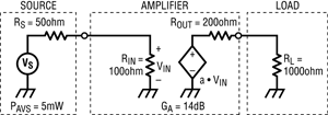 與通過將電源功率與放大器增益的dB數(shù)相加得到的14dB相比,這個(gè)結(jié)果相差很大。這是因?yàn)槎丝谧杩共皇枪潭ㄔ谀硞(gè)Ro值上。電源提供的功率與提供給放大器的實(shí)際功率是不同的。放大器的可用功率增益大于進(jìn)入負(fù)載的實(shí)際功率增益。這常常是采用諸如運(yùn)算放大器等組件時(shí)的情況,而運(yùn)算放大器完全由其電壓增益定義。它們的輸入阻抗與50Ω相去甚遠(yuǎn),輸出則經(jīng)常是低阻抗電壓源。