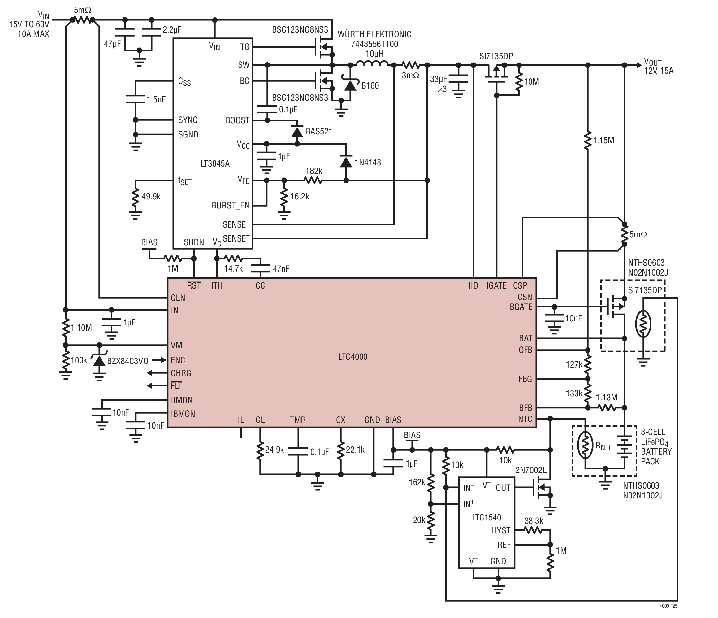 LTC4000 48V~10.8V/10A 降壓型轉(zhuǎn)換器 3 節(jié) LiFePO4 電池充電器具 2.9h 終止定時器、1.25A 涓流充電電流和充電 PFET 熱保護