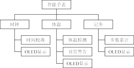 本文設(shè)計(jì)的智能手表主要具有時(shí)鐘功能、體溫實(shí)時(shí)檢測(cè)功能和計(jì)步功能,系統(tǒng)功能結(jié)構(gòu)如圖 1 所示。