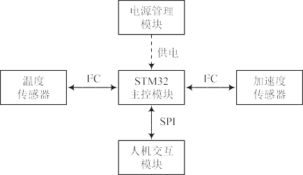 多功能智能手表系統(tǒng)硬件主要由電源管理模塊、主控芯片模塊、溫度傳感器模塊、加速度傳感器模塊和 OLED 液晶顯示器與按鍵組成,硬件系統(tǒng)的組成及連接關(guān)系如圖 2 所示。電源管理模塊將不穩(wěn)定的電池電壓轉(zhuǎn)換成系統(tǒng)需要的 3.3 V 穩(wěn)定電壓,并輸送給各個(gè)模塊。主控芯片從溫度傳感器和加速度傳感器獲取采集數(shù)據(jù)并對(duì)數(shù)據(jù)進(jìn)行算法處理,最終通過(guò)人機(jī)交互模塊顯示出來(lái)。
