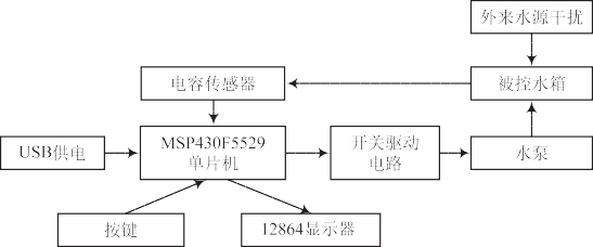 系統(tǒng)基于 TI 公司單片機 MSP430F5529 設(shè)計,包括傳感器檢測模塊、傳感器輸出信號變換模塊、時鐘模塊、顯示模塊、按鍵設(shè)置模塊、直流水泵驅(qū)動模塊、光耦隔離模塊等。系統(tǒng)設(shè)計框圖如圖 1 所示。