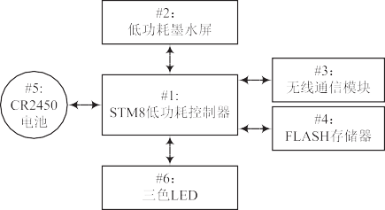 電子標(biāo)簽系統(tǒng)硬件包括六個(gè)主要部分,分別為低功耗控制器系統(tǒng)模塊、低功耗墨水屏顯示模塊、無(wú)線通信模塊、FLASH 存儲(chǔ)功能模塊、CR2450 電池模組、RGB 三色 LED 顯示。電子標(biāo)簽結(jié)構(gòu)如圖 2 所示。