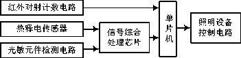 區(qū)域內(nèi)燈光節(jié)能控制器通過單片機的內(nèi)部程序?qū)崿F(xiàn)對區(qū)域內(nèi)照明燈管系統(tǒng)進行自動化智能控制和調(diào)節(jié)。從整個系統(tǒng)的功能效果來看,其系統(tǒng)的輸入?yún)?shù)主要是區(qū)域內(nèi)人體存在信號、環(huán)境溫濕度、光照強度等特征信息當(dāng)量。即:在區(qū)域內(nèi)檢測到有人存在時,結(jié)合環(huán)境溫濕度、環(huán)境光照等外部因素,動態(tài)判斷是否開啟燈光系統(tǒng)以及照明燈具相互節(jié)能匹配方案等。當(dāng)環(huán)境光照等滿足區(qū)域內(nèi)照明規(guī)范需求時,就會控制燈具不打開,即只有當(dāng)區(qū)域內(nèi)存在學(xué)習(xí)人員且外部環(huán)境光照強度參數(shù)達到某種閾值條件以下時,在內(nèi)部計算分析判斷合理調(diào)節(jié)照明燈具開啟匹配方案,達到區(qū)域內(nèi)照明燈光高效穩(wěn)定節(jié)能運行效果叫為了實現(xiàn)對區(qū)域內(nèi)照明系統(tǒng)進行高效節(jié)能而又能靈活控制,且不耗費多余的人力、物力,系統(tǒng)采用單片機作為控制系統(tǒng)的核心控制器,同時輔助以人體感應(yīng)裝置或熱釋電傳感器、紅外對射計數(shù)裝置、光敏元件檢測裝置等硬件系統(tǒng)保證控制系統(tǒng)的可靠性和準(zhǔn)確性。結(jié)合各種傳感器采集的區(qū)域?qū)嶋H數(shù)據(jù),結(jié)合硬件實現(xiàn)信號的傳輸和控制器的分析處理,實現(xiàn)節(jié)能控制系統(tǒng)對局域內(nèi)照明系統(tǒng)自動化、智能化節(jié)能控制。