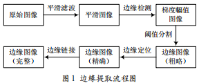根據(jù)視覺(jué)理論,人眼對(duì)物體的辨識(shí)首先是它的輪廓,而機(jī)器視覺(jué)系統(tǒng)模仿人的視覺(jué)識(shí)別目標(biāo)圖像,首先得到表征目標(biāo)圖像輪廓的要素圖。圖像的邊緣是圖像的最基本特征,邊緣檢測(cè)是機(jī)器視覺(jué)檢測(cè)技術(shù)的關(guān)鍵和基礎(chǔ),邊緣的定位精度直接影響尺寸的檢測(cè)精度。邊緣檢測(cè)的步驟一般為平滑濾波、邊緣檢測(cè)、閾值分割、邊緣定位和邊緣連接,具體過(guò)程如圖 1 所示。