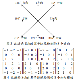 一副圖像的邊緣具有很多的方向,除了水平方向和垂直方向外,還有其他的方向。因此,為了能有效地獲取圖片的完整有效信息,可以設(shè)想在經(jīng)典 Sober 算子水平和垂直兩個(gè)方向模板的基礎(chǔ)上,增加在 45°,135°,180°,225°,270°,315°方向上的 6 個(gè)方向模板 ( 見(jiàn)圖 3),具體模板如圖 4 所示。