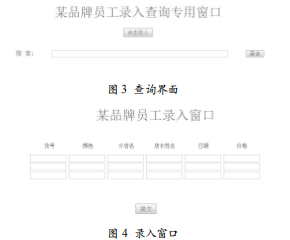 店員從登陸界面進(jìn)入后,即顯示圖3所示的查詢界面。圖中唯一的輸入框中采用的是數(shù)據(jù)庫篩選的功能。所有商品通過錄入或者數(shù)據(jù)庫本身保存在數(shù)據(jù)庫中后,通過搜索數(shù)據(jù)庫中某一相關(guān)字段而一層一層篩選,最后得到想要查詢的數(shù)據(jù)。比如:商場的店鋪不同,店鋪內(nèi)的貨號開頭是各不一樣的;根據(jù)店鋪貨號的開頭不同,就可以直接篩選到店鋪,而每家店鋪內(nèi)的貨號也是各不相同的,這樣就得到了想要知道的商品信息了。由于數(shù)據(jù)庫存儲(chǔ)量大,篩選過程可能過慢,也可以直接復(fù)制粘貼需要查詢的貨號,點(diǎn)擊查詢按鈕即可。兩種方法都可以實(shí)現(xiàn)查詢功能。