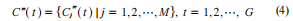 (8)計(jì) 算 群體 Cj('t)(j=1,2,…,M,t=1,2,…,G)中每個(gè)粒子與目標(biāo)函數(shù)的適應(yīng)值,將最優(yōu)的粒子 x(jt)與 γ (jt)分別保存在 M(jt),γ (jt)中。將該粒子群體經(jīng)歷過的最優(yōu)位置保存在 P(jt)中,同時(shí)找出群體 C"(t)中的最優(yōu)粒子,并保存在 Pg(t)中。