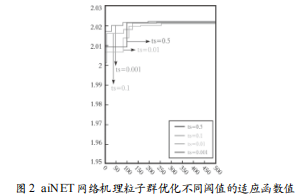 通過圖 2 可以看出,閾值越接近 0.001 時(shí),優(yōu)化速度越快。這是因?yàn)殚撝翟酱?,把相同的粒子去掉,重新加入新的粒子時(shí),雖然增加了多樣性,但是也減弱了粒子的尋優(yōu)速度。如果函數(shù)值過小,網(wǎng)絡(luò)抑制起不到作用。經(jīng)過實(shí)驗(yàn)比較發(fā)現(xiàn),網(wǎng)絡(luò)抑制閾值在 0.001 左右,為比較合適的值。