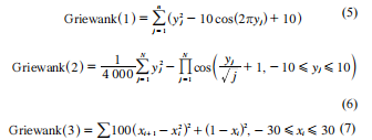 基于參考文獻(xiàn),采用多個(gè)高維的典型 Griewank 測試函數(shù),可測試本課題提出的 aiNET 網(wǎng)絡(luò)機(jī)理粒子群優(yōu)化搜索全局最優(yōu)解的能力。取目標(biāo)函數(shù)的相反數(shù)作為抗體的適應(yīng)度來評價(jià)抗體解的優(yōu)良性,再求以下兩個(gè)函數(shù)在定義域內(nèi)的極小值 :