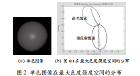 實(shí)際上,分離反射分量的方法可在一個最大色度強(qiáng)度空間中展開。圖2所示是單色圖像在最大色度強(qiáng)度空間上的分布圖。