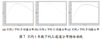 圖7所示是不同γ參數(shù)下的三通道分布特性曲線,其中x軸代表1/γ,y軸代表均值。經(jīng)統(tǒng)計原圖中被標(biāo)示為高光區(qū)的對應(yīng)像素在同色度圖像上的三個顏色分量的均值,在γ接近真實(shí)值時,達(dá)到最大值。本文將三個通道均值最大值點(diǎn)所對應(yīng)的γ值取均值,作為每幅圖像的γ自適應(yīng)估計值。