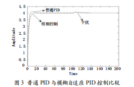 從仿真結(jié)果可以看出:模糊PID參數(shù)自整定控制器具有較小的超調(diào)量和較短的調(diào)節(jié)時(shí)間,并具有較好的動(dòng)態(tài)響應(yīng)特性和穩(wěn)態(tài)特性,優(yōu)于普通PID控制;其次,加入擾動(dòng)和延遲時(shí),模糊控制器具有較好的魯棒性,同時(shí),它還可以隨輸入的不同自動(dòng)校正參數(shù),因而具有較好的自適應(yīng)性能。