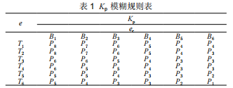 其語(yǔ)言變量取上述六個(gè)模糊值,分別代表負(fù)大到正大。輸出語(yǔ)言變量AKp、W、&爲(wèi)則取表內(nèi)的八個(gè)模糊值,分別代表負(fù)大到正大。設(shè)e、e°和Kp、K、、KA均服從正態(tài)分布,因而可得到各模糊子集的隸屬度,根據(jù)各模糊子集的隸屬度賦值表和各參數(shù)模糊控制模型可得到精確化后的輸出,進(jìn)而調(diào)整PID參數(shù)。