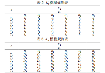 所謂模糊自整定參數(shù),就是找出PID三個(gè)參數(shù)與e和ec之間的模糊關(guān)系。這個(gè)模糊關(guān)系或者說是模糊規(guī)則是總結(jié)工程設(shè)計(jì)人員和實(shí)際操作人員的技術(shù)知識(shí)和實(shí)際操作經(jīng)驗(yàn)得出的,以此建立合適的模糊規(guī)則表,得到針對(duì)PID三個(gè)參數(shù)分別整定的模糊控制表,通過計(jì)算當(dāng)前e和%并利用模糊控制表進(jìn)行模糊推理調(diào)整參數(shù)。三個(gè)參數(shù)的模糊規(guī)則表如表1、表2、表3所列。