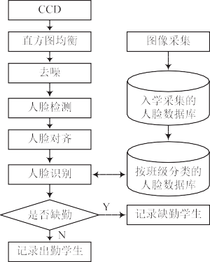 在學(xué)生入學(xué)時(shí),都會(huì)采集他們的面部圖像,存儲(chǔ)在數(shù)據(jù)庫(kù)中,并按班級(jí)分類(lèi),將這些圖像經(jīng)過(guò)預(yù)處理后按班級(jí)保存在學(xué)生人臉特征數(shù)據(jù)庫(kù)中。在上課考勤時(shí),對(duì)在教室采集到的圖像進(jìn)行人臉檢測(cè)和對(duì)齊,并和數(shù)據(jù)庫(kù)中圖像逐一進(jìn)行比較,如果能識(shí)別出來(lái),則在考勤數(shù)據(jù)庫(kù)中標(biāo)記出勤信息。開(kāi)始上課后,系統(tǒng)將自動(dòng)啟動(dòng)考勤流程,在一節(jié)課堂中多次采集學(xué)生圖像并進(jìn)行人臉識(shí)別,自動(dòng)獲得出勤率,節(jié)省了大量時(shí)間,而且不會(huì)有任何弄虛作假情況。具體流程如圖 2 所示。