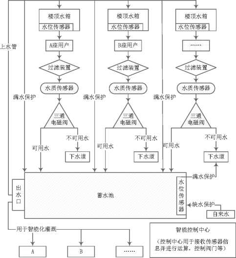 系統(tǒng)基于物聯(lián)網(wǎng)技術(shù)(IOT),通過系統(tǒng)智能化管理,對日常生活中的廢水(洗菜水、洗衣水、洗澡水等)進行統(tǒng)一的判斷、處理、分類,把可二次利用的廢水儲存在地面下的總蓄水池中,通過智能化控制,把廢水進行綜合利用。