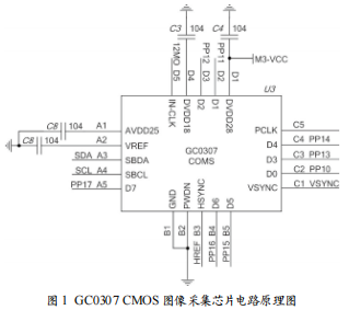 整個(gè)系統(tǒng)設(shè)計(jì)構(gòu)成了一體化光學(xué)指紋識(shí)別模塊。模塊設(shè)計(jì)采用光學(xué)暗背景成像原理,加入特有活體檢測(cè)芯片,在解決干手指效應(yīng)的同時(shí)解決殘留指紋誤識(shí)別、橡膠假指紋等問題。圖1所示為格科微電子有限公司的光學(xué)GC0307CMOS圖像采集芯片應(yīng)用電路原理圖。該款CMOS圖像采集芯片是高精度、低功耗、微體積的高性能相機(jī)的內(nèi)置式組件,它把實(shí)現(xiàn)優(yōu)質(zhì)VGA影像的CMOS影像傳感器與高度集成的影像處理器、嵌入式電源和高質(zhì)量的透鏡組結(jié)合在一起,輸出JPEG圖像或圖像視頻流,支持8/10位數(shù)字傳輸JPEG圖像和YCbCr接口,提供了完整的影像解決方案。
