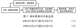 本系統(tǒng)的指紋圖像采集過程如圖2所示。系統(tǒng)軟件設(shè)計(jì)部分則針對(duì)畸變糾正采用了四點(diǎn)轉(zhuǎn)正算法。