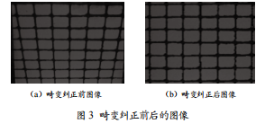 通過公式(1)和公或2)可以得到從(x,y)到(u,v)的變換,其中,A?H由光路決定,可以由具體測(cè)定數(shù)據(jù)最終確定,通過實(shí)測(cè)可以獲得原始數(shù)據(jù)。圖3所示展示了原始圖像和畸變糾正前后圖像的效果差異。