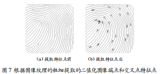 圖7是最后根據(jù)圖像紋理的粗細(xì)二值化圖像,并根據(jù)端點(diǎn)和交叉點(diǎn)提取特征點(diǎn)。
