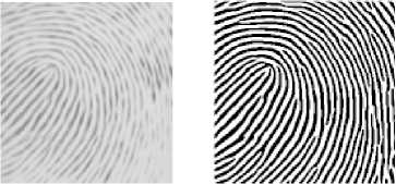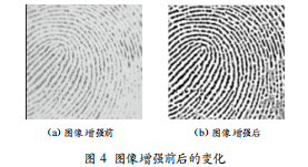 如圖5可見,改進(jìn)的Sobel算子在原Sobel算子的基礎(chǔ)上,能顯著地分割出正確圖像的面積,幾乎能在整個(gè)畫面區(qū)域提取出正確的方向來。系統(tǒng)對(duì)圖像進(jìn)行了Gabor濾波和圖像數(shù)據(jù)二值化。指紋圖像屬于紋理圖像,紋理圖像采用Gabor濾波器[4],利用每一點(diǎn)的點(diǎn)方向沿方向指向增強(qiáng),沿方向的法線方向減弱。Gabor濾波器能很好地拼接斷紋,濾除環(huán)境噪聲,最后將Gabor濾波后的圖像做雙窗口均值門限二值化: