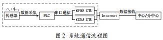 考慮水情中心與分中心工作異??赡茉斐伤閿?shù)據(jù)無(wú)法正常接收,遙測(cè)站數(shù)據(jù)通信終端(DataTransferUnit,DTU)均設(shè)計(jì)雙發(fā)工作機(jī)制,即每時(shí)段報(bào)送數(shù)據(jù)均同時(shí)向水情中心及分中心發(fā)送,中心與分中心進(jìn)行信息共享。系統(tǒng)通信流程圖如圖2所示。