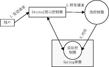 在圖3中,Struts只是配置一個(gè)偽控制器,這個(gè)偽控制器的功能實(shí)際由Spring容器中的控制器來完成,這就實(shí)現(xiàn)了讓核心控制器調(diào)用Spring容器中的Action來處理用戶請(qǐng)求。