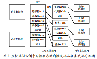 內(nèi)核程序運(yùn)行在32位保護(hù)模式下,初始化階段主要包括重新設(shè)置GDT表,設(shè)置系統(tǒng)定時(shí)器芯片,重新設(shè)置IDT表并且設(shè)置時(shí)鐘和系統(tǒng)調(diào)用中斷門。內(nèi)核示例中所有代碼和數(shù)據(jù)段都對(duì)應(yīng)到物理內(nèi)存同一個(gè)區(qū)域上,即從物理內(nèi)存0開(kāi)始的區(qū)域。在虛擬地址空間中內(nèi)核程序的內(nèi)核代碼和任務(wù)代碼分配圖如圖2所示。