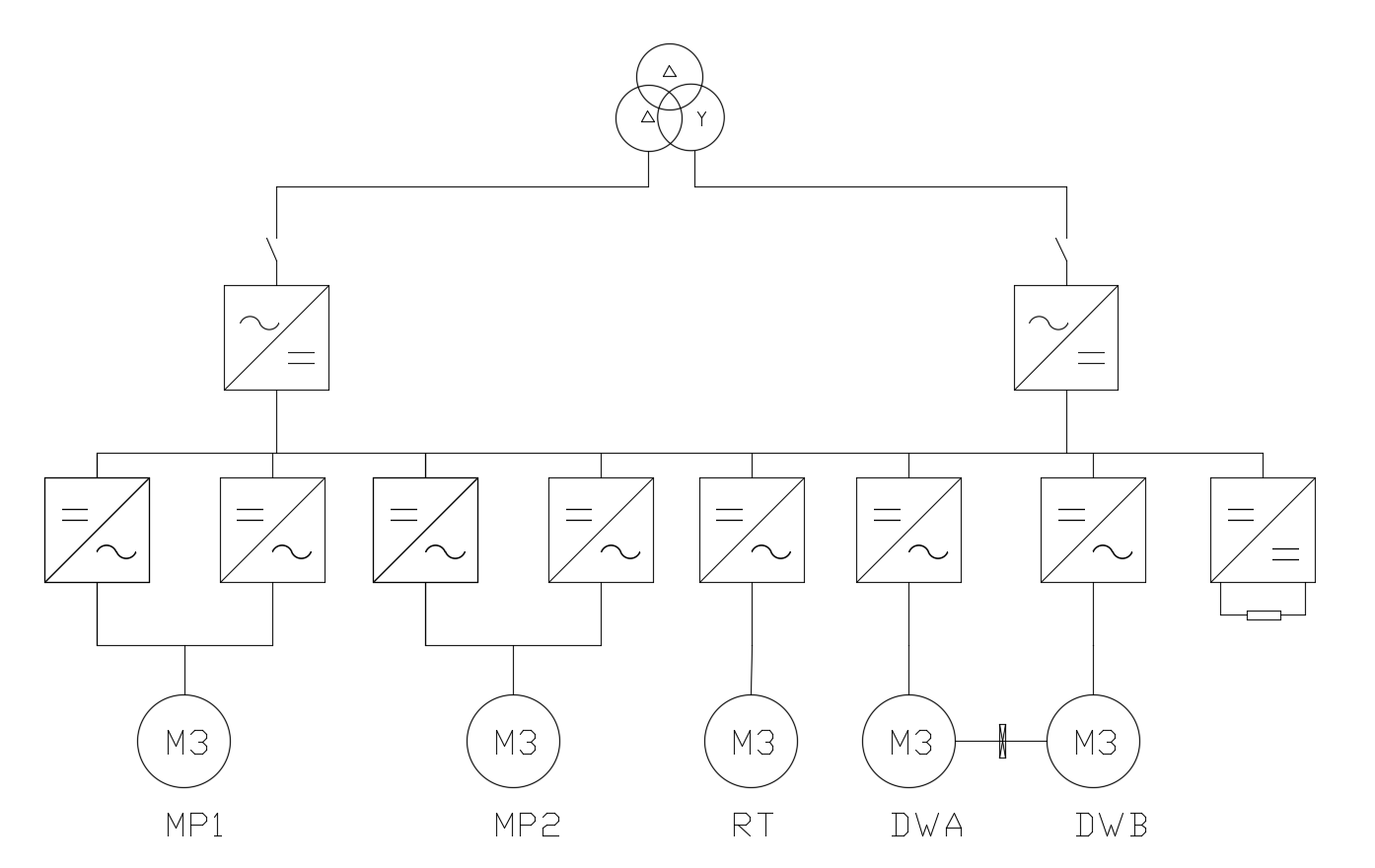 本次英威騰提供的是絞車A/B,轉(zhuǎn)盤、泥漿泵1/2設(shè)備變頻器,其系統(tǒng)主回路圖如下:
