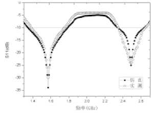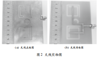 根據(jù)上述仿真優(yōu)化的結(jié)果,加工并制作了天線實(shí)物,如 圖 2 所示。圖 2(a)為天線正面圖,圖 2(b)為天線背面圖。 為了驗(yàn)證仿真結(jié)果的準(zhǔn)確性,采用 Agilent E5071C 矢量網(wǎng)絡(luò) 分析儀實(shí)際測量了天線的 S 參數(shù),并將實(shí)測和仿真結(jié)果進(jìn)行 了對比。由于實(shí)驗(yàn)條件的限制,未能對天線的軸比、方向圖等 參數(shù)進(jìn)行實(shí)際測量。