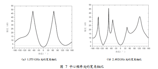 頻率在 1.575 GHz,2.492 GHz 時天線圓極化軸比隨角度變化的曲線分別如圖 7(a)、(b)所示,從圖 7 可見,該天線在中心頻點(diǎn)處的軸比小于 3 dB 的波束寬度,大約達(dá)到了65°。