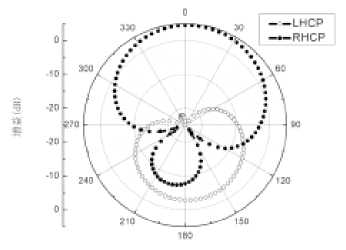 該天線的結(jié)構(gòu)決定了其具有雙面輻射的特性。天線在中 心頻率1.575 GHz和2.492 GHz處的仿真歸一化方向圖分別如 圖6(a)、圖6(b)所示。從兩幅圖可以看出天線在正面輻射 的右旋圓極化波的增益遠(yuǎn)大于左旋圓極化波的增益,故在正 面輻射右旋圓極化波。與此相反,在背面輻射的為左旋圓極 化波。