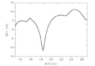 天線回波損耗的仿真結(jié)果如圖3所示??梢钥闯?,該天 線在頻段1.35?1.78 GHz, 2.35?2.63 GHz內(nèi)的S11均小 于一10 dB,相對駐波帶寬達(dá)到38.5%,滿足指標(biāo)要求。天線 在1.3?2.7 GHz內(nèi)增益的仿真曲線圖如圖4所示,可看出天 線在中心頻率附近處的增益都較好,整體輻射性能達(dá)到要求。