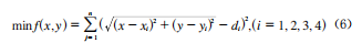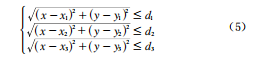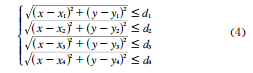 由三次樣條插值得出待測(cè)節(jié)點(diǎn)與各個(gè)參考節(jié)點(diǎn)的距離dge,(i=1,2,3,4)之后,以參考節(jié)點(diǎn)為圓心、待測(cè)節(jié)點(diǎn)到參考節(jié)點(diǎn)的距離為半徑作圓,初步判定待測(cè)點(diǎn)在4個(gè)圓所交的公共區(qū)域U內(nèi),即X。eU,并有不等式方程組式(4)成立,其中(x,y)為第i個(gè)參考節(jié)點(diǎn)的坐標(biāo)。