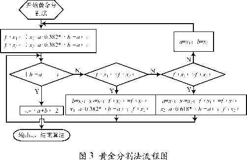 DFP法主要涉及兩個(gè)主要的算法,分別是利用黃金分割法進(jìn)行一維捜索和利用DFP法計(jì)算最小點(diǎn)對(duì)應(yīng)的自變量的值。其中,DFP算法流程如圖2所示:其中s為控制誤差,X。為輸入的初始值,E是與X。同維的單位矩陣。黃金分割法流程如圖3所示。