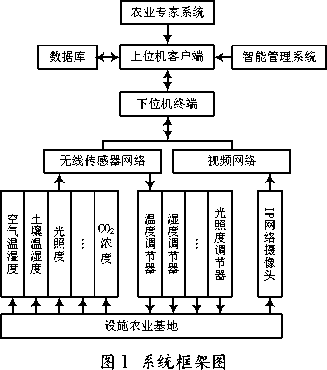 智能監(jiān)控系統(tǒng)主要有無線傳感器網(wǎng)絡(luò)、視頻監(jiān)控和監(jiān)控終端3部分構(gòu)成。系統(tǒng)框架如圖1所示。