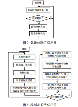 由于溫室系統(tǒng)是一個(gè)非線性、多變量的復(fù)雜系統(tǒng)。經(jīng)典控制理論很難到達(dá)滿意的控制效果,因此,模糊控制算法成為了我們的首選。設(shè)計(jì)模糊神經(jīng)網(wǎng)絡(luò)控制器主要包括確定模型的輸入/輸出個(gè)數(shù)、模糊神經(jīng)網(wǎng)絡(luò)的層數(shù)、神經(jīng)元的激勵(lì)函數(shù)和去模糊化的方法等??紤]到影響作物生長主要因素為溫度和濕度。那么,模糊神經(jīng)網(wǎng)絡(luò)的控制器輸入個(gè)數(shù)為2,采用4輸入量,即溫、濕度誤差和溫濕度誤差變化率[9]。其程序流程圖如圖6所示。