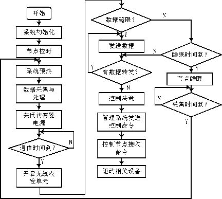 系統(tǒng)主程序包括數(shù)據(jù)采集、數(shù)據(jù)通信、數(shù)據(jù)處理、無線收發(fā)、電源控制等模塊。其流程圖如圖3所示。