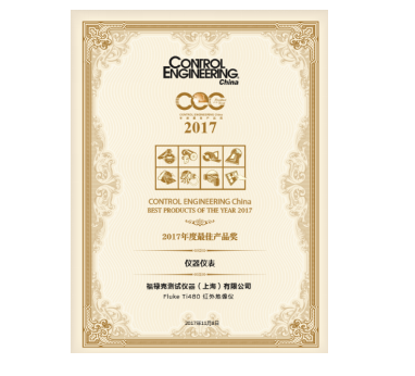 2017年11月8日,工控自動化領域最權威的年度新產品評選活動--CONTROL ENGINEERING China 2017(第十三屆)年度最佳產品獎頒獎典禮在上海中國工博會上隆重舉行,福祿克 Ti480 紅外熱像儀榮獲年度最佳產品獎。