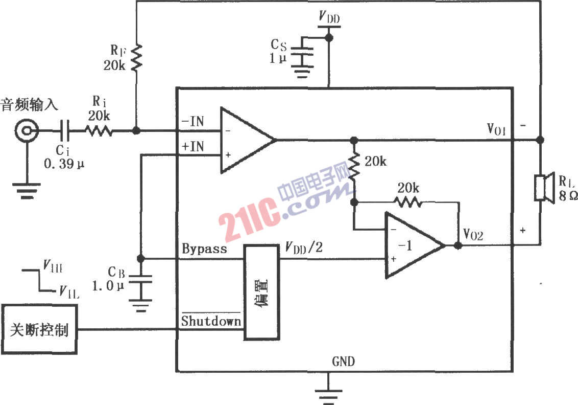 如圖所示為LM4903/4905音頻功率放大器的典型應(yīng)用電路(MSOP封裝)。音頻信號輸入后,經(jīng)過Ci、Ri耦合加到放大器的反相輸入端(4腳),而放大器的同相輸入端(3腳)則通過CB交流接地,功率放大后從Vo1(5腳)和Vo2(8腳)以電橋輸出的形式加到揚聲器。1腳為邏輯低電平時放大器微功率關(guān)斷,為邏輯高電平時放大器全功率工作。