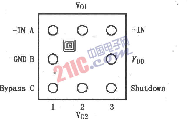 LM4904音頻功率放大器主要設計用于移動電話和其他便攜式通信設備,采用5V電源工作,能夠輸出1W連續(xù)平均功率,帶動8Ω BTL負載,總諧波失真及噪聲(THD+N)低于1%。LM4904有一個低功耗關斷模式,邏輯高電平有效;還有熱關斷保護電路。LM4904的引腳排列如圖所示。