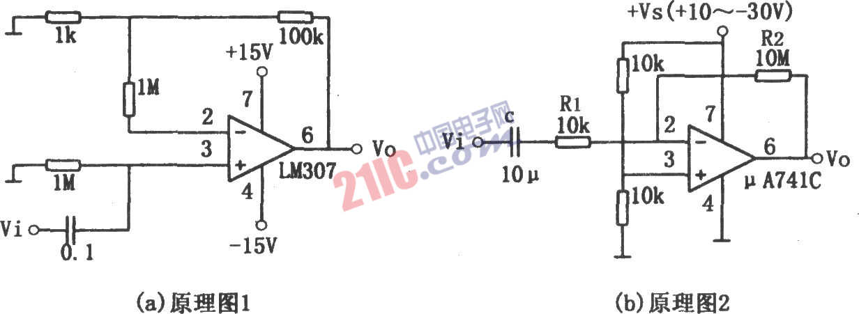 如圖所示為簡單音頻放大電路。使用集成運(yùn)放構(gòu)成的音頻放大器,其工作穩(wěn)定,易于加負(fù)反饋,所以很容易獲得均衡特性。另外,在各頻道之間串音干擾小,它也很容易進(jìn)行多頻道的輸入混合。圖(a)所示電路使用雙電源(Vs=±15V),同相、反相輸入端分別到地的靜態(tài)電阻基本平衡,其輸入信號(hào)Vi由0.1μF耦合電容送入LM307N的同相輸入端(引腳3)。對(duì)信號(hào)源而言,其輸入電阻約為1MΩ,因而其等效負(fù)載很輕。該電路的電壓放大倍數(shù)約為101倍,并且具有較好的動(dòng)態(tài)特性。圖(b)所示電路采用單電源供電方式,因?yàn)榻涣鞣糯笃髦胁淮嬖谛盘?hào)的直流電平問題,因而這種供電方式是可取的。該電路中,音頻信號(hào)K通過耦合電容C和電阻R1送入,μA741C的反相輸入端(引腳2)。由圖可知,電路中對(duì)直流分量引入了100%的負(fù)反饋(c對(duì)直流分量相當(dāng)開路),所以對(duì)失調(diào)電壓無放大作用。該電路的電壓放大倍數(shù)為:Av=-R2/R1=-1000(即60dB)。但應(yīng)強(qiáng)調(diào)指出的是:R1、R2和電容C具有低頻衰減和相移作用,當(dāng)信號(hào)頻率較低時(shí),可適當(dāng)增大電容C的容量。