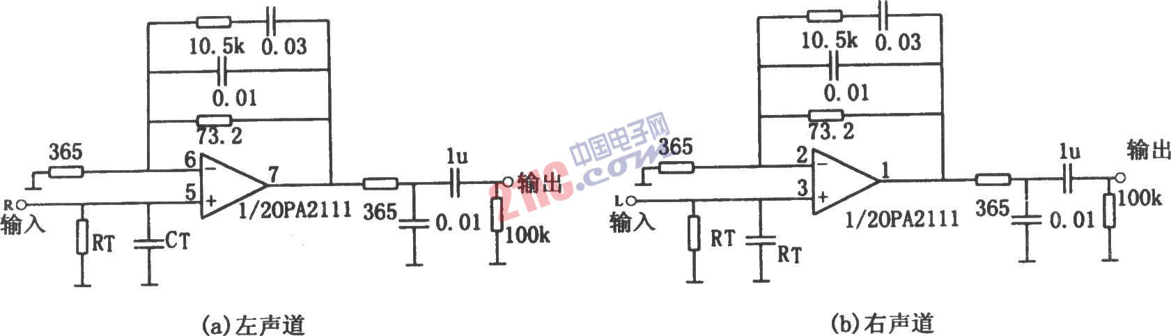 如圖所示為均衡立體聲前置放大電路。圖(a)為左聲道前置放大電路,圖(b)為右聲道前置放大電路。該電路采用了雙運(yùn)放OPA2111。左、右聲道分別使用雙運(yùn)放OPA2111中的一個(gè)運(yùn)放。因而左、右聲道之間具有良好的匹配性(增益相差3dB,偏流相差0.5pA,漂移相差±0.5μV/℃),用于構(gòu)成均衡立體聲前置放大極為適當(dāng)。由圖可知,左、右聲道電路完全相同,電路中的電容0.01μF、0.03μF和1μF均起改善音質(zhì)的作用,半可變電容CT的調(diào)整范圍約為0.01~0.047μF。圖示電路的中頻增益約為26dB。
